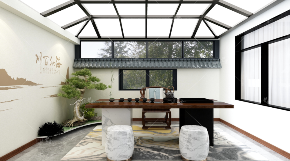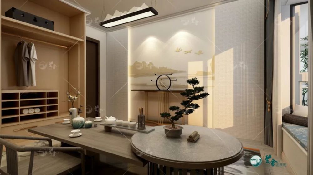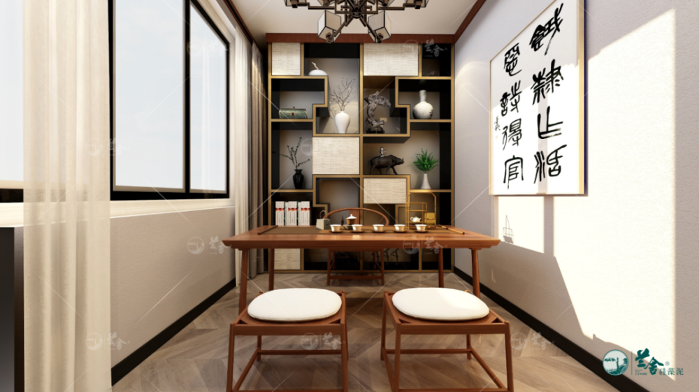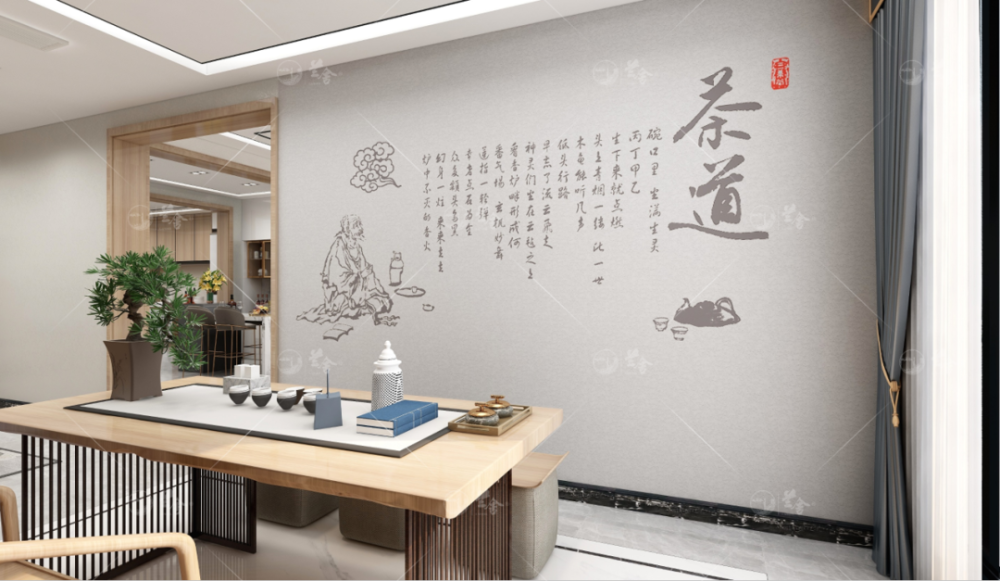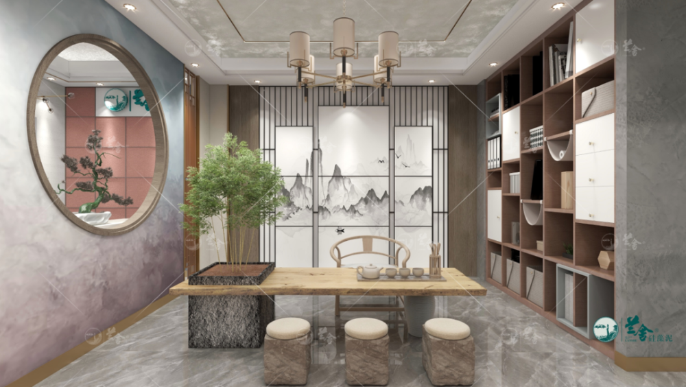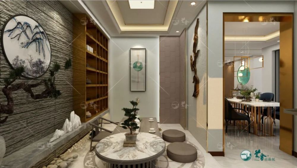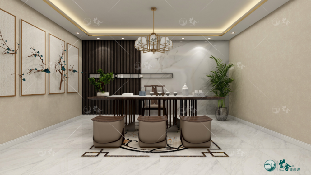 茶具、器物、盆景、水墨画,这些茶室中的文雅之物,打造了富有特色的茶室。兰舍用硅藻泥、艺术漆呈现的诗词画作,更是茶室的雅致之作。一字一画,一面墙将文化底蕴完美呈现。