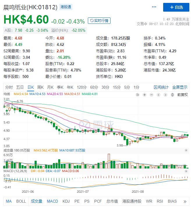 截止发稿时间,晨鸣纸业股价跌0.43%,报4.60港元。