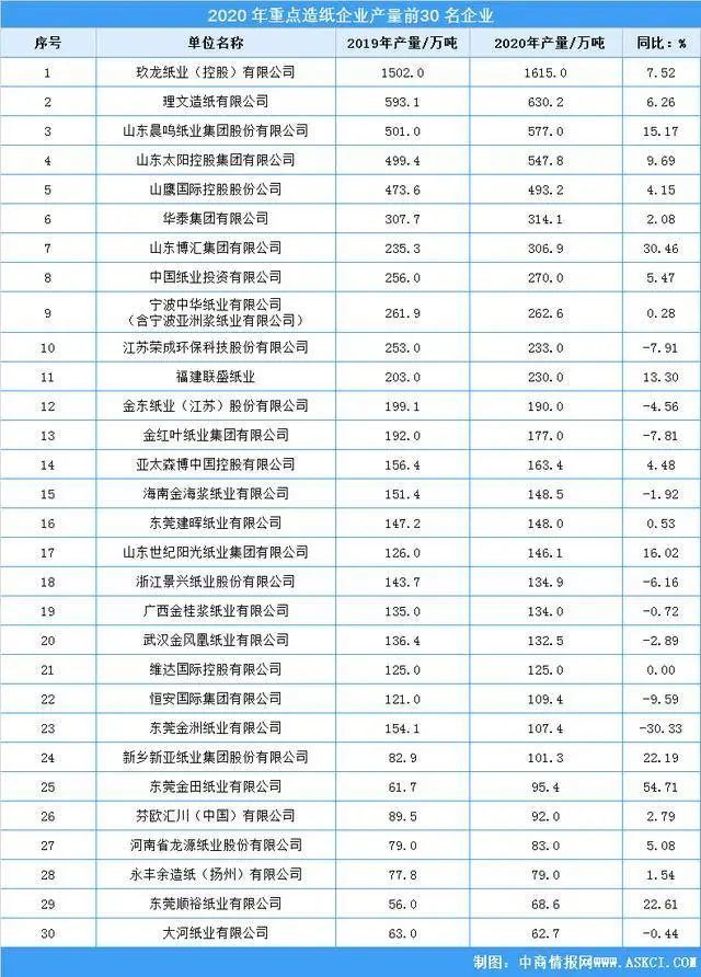近日,中国造纸业协会公布《中国造纸工业2020年度报告》。榜单根据2020年各造纸企业年产量进行排名。