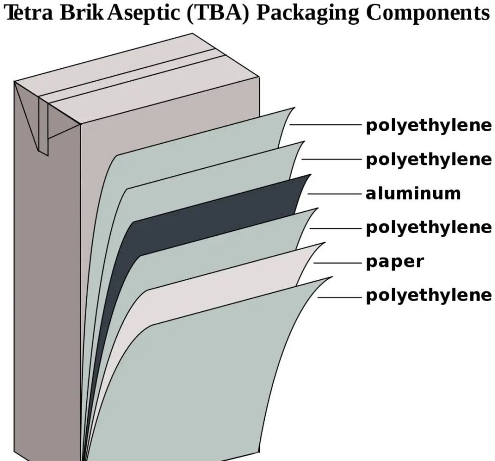 利乐包装,是一款由铝箔、PE塑料薄膜、纤维、纸等6层不同材质制作而成的复合结构产品。