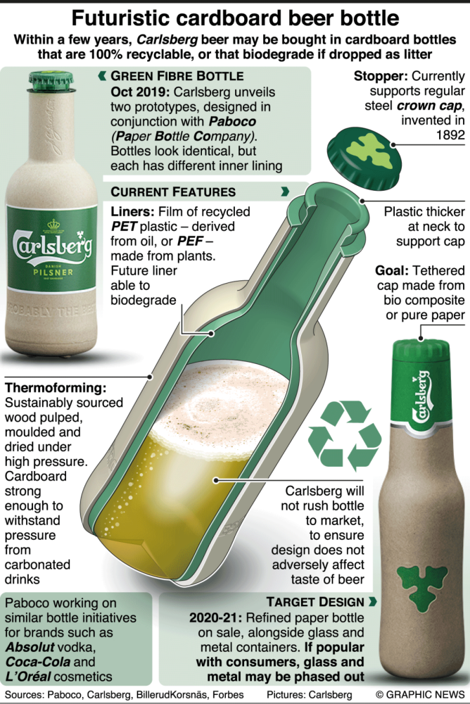 早在2019年,嘉士伯就公布了世界上第一个纸质啤酒瓶。