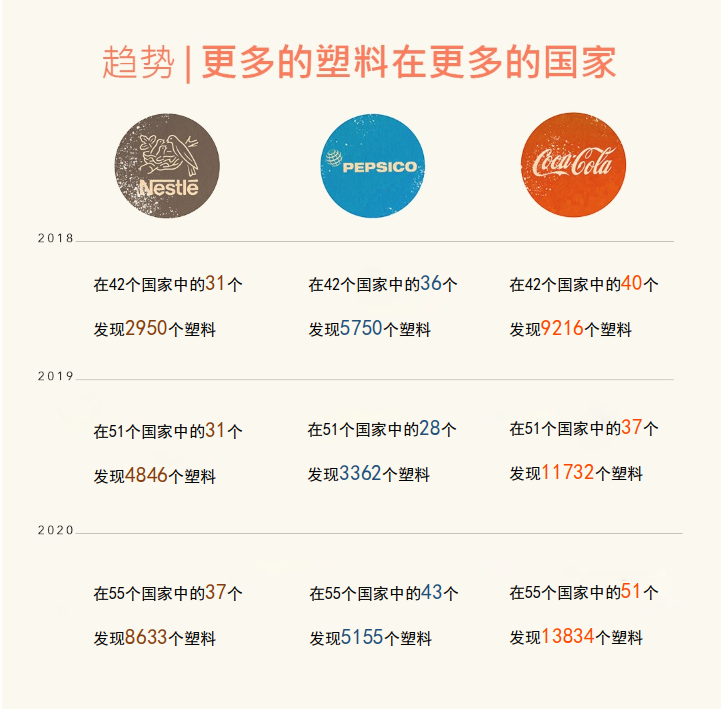 排名第二的百事,和排名第三的雀巢,两者的塑料污染加起来,还没可口可乐一家公司多。