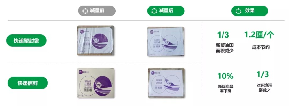 据核算,相较旧版,新设计出的快递包装油印面积减少了1/3,次品率下降10%,成本节约1.2厘/个。推广普及后,预计可较大减少印刷产生的污染量,降低残次品产生的废弃物量。