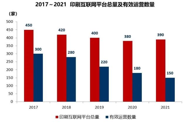 为了更准确了解实际活跃情况,剔除那些不再活跃或已停止运营、只有网站留存的印刷互联网平台,2021年有效运营的数量约为150家,比2017年有效运营300家,下降了50%。