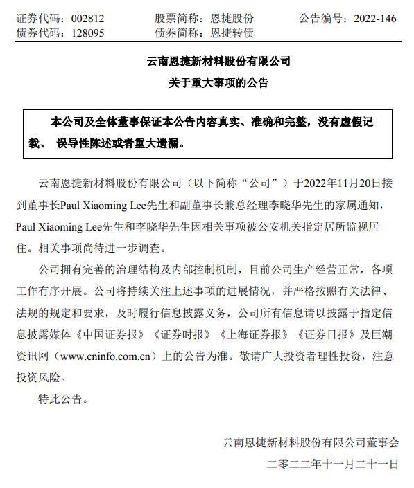 国内锂离子电池隔膜龙头企业云南恩捷新材料股份有限公司(以下简称“恩捷股份”)发布公告称,公司于2022年11月20日接到董事长Paul Xiaoming Lee先生和副董事长兼总经理李晓华先生的家属通知,Paul Xiaoming Lee先生和李晓华先生因相关事项被公安机关指定居所监视居住。相关事项尚待进一步调查。