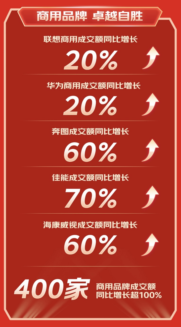 诸多品质值得信赖的3C数码大牌齐聚京东,带来了海量物美价优的产品,充分点燃了客户的采购热情,各大品牌纷纷收获了增长。战报数据显示,联想商用成交额同比增长20%;华为商用成交额同比增长20%;奔图成交额同比增长60%;佳能成交额同比增长70%;海康威视(002415)成交额同比增长60%;有400家商用品牌成交额同比增长超100%。
