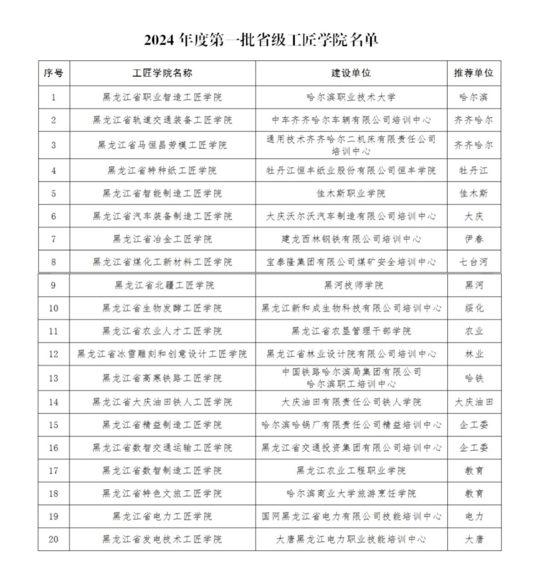 省人大常委会副主任、省总工会主席贾玉梅出席授牌仪式,省总工会党组书记、副主席栾志成主持授牌仪式,省总工会副主席、党组成员付尧宣读命名决定。会议强调,要聚焦中心大局,加快推进龙江工匠学院体系建设。落实因地制宜发展新质生产力的战略部署,聚焦本地区本行业区域经济特色和产业优势,以工会、企业、院校合作为主线,积极推动龙头企业、新质生产力产业链企业和有条件的民营企业建设工匠学院,全面打造示范作用突出、覆盖范围广泛、培育成果显著的工匠学院体系,为广大技能人才持续打造“成长摇篮”,为区域经济高质量发展提供人才支撑。要发挥资源优势,创新打造龙江工匠学院特色品牌。充分发挥我省科教资源和产业资源优势,聚焦电子信息、航空航天、人工智能、先进制造、新能源、新材料等战略性新兴产业,积极开发培训资源、丰富培训方式、加大培训力度、扩大培训范围,不断在工匠人才培养上提质扩量,着力打造具有广泛影响力和辐射带动作用的龙江工匠学院特色品牌。要强化规范管理,努力推动工匠学院建设走在前列。加强工匠学院规范化、制度化建设,严格落实资金使用管理有关规定,形成申报、审核、命名、运行、监督等方面全流程闭环工作链条,确保工匠学院体系建设规范有序、平稳运行。对作用发挥突出的工匠学院推荐参评国家级工匠学院建设点,不断开创工匠学院建设工作新局面。