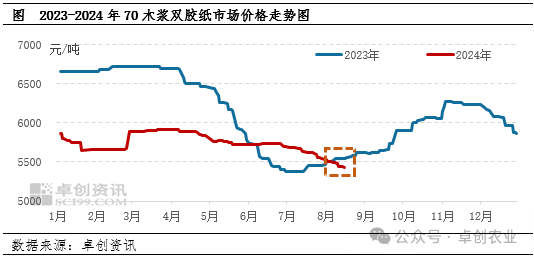 从成本情况来看,进入8月木浆市场价格震荡偏弱。截至8月14日,针叶浆、阔叶浆及化机浆市场均价分别为6094元/吨、4963元/吨和3667元/吨,较7月末分别下跌0.58%、1.11%和0.23%。仅从原料角度来看,其成本较7月末下滑0.88%,成本端持续松动,对于纸价有偏空影响。