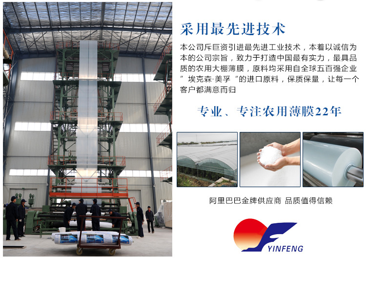 产品简介:该产品采用埃克森美孚茂金属、EVA树脂及流滴消雾、防老化等助剂利用三层共挤内冷工艺共挤而成。薄膜除具有优异的长寿、流滴效果外,还具有很好的耐寒、保温及减雾、消雾效果。该产品形成的温室上温快,散热慢,改善了棚内作业环境,减少了瓜果蔬菜病虫害的发生,能够使作物提前上市**大限度的提高菜农的经济收入。