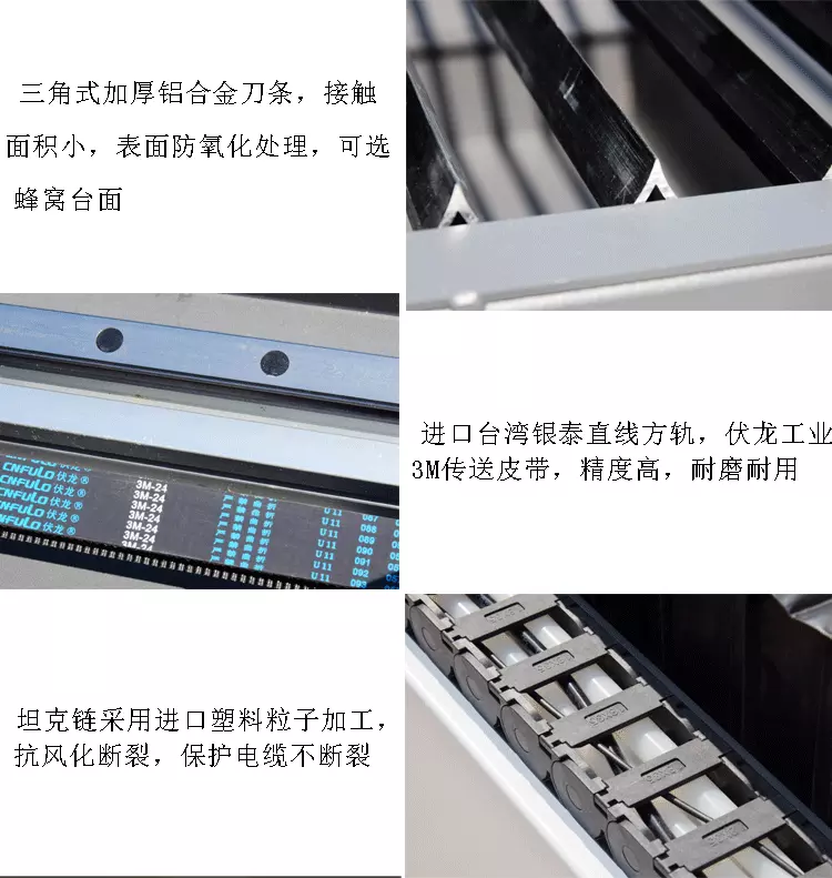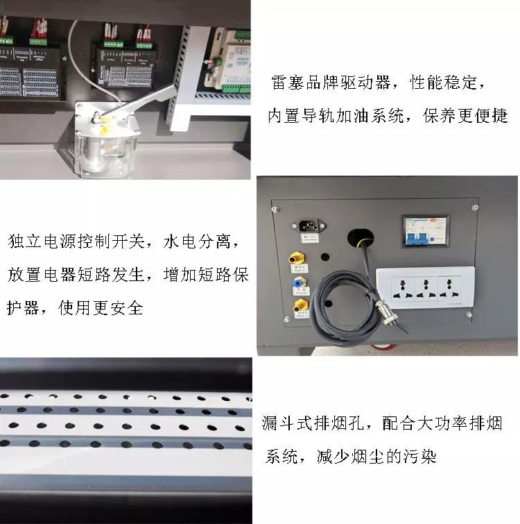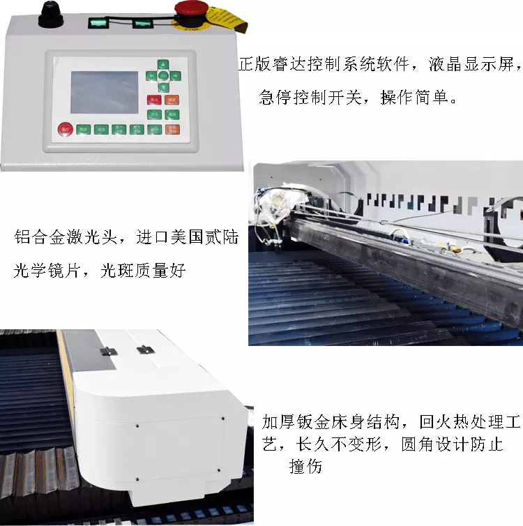 6、光路稳定设计,配工业水冷机,确保大幅面切割时,工作台面上各个位置激光功率输出一致,效率高,加工质量稳定。