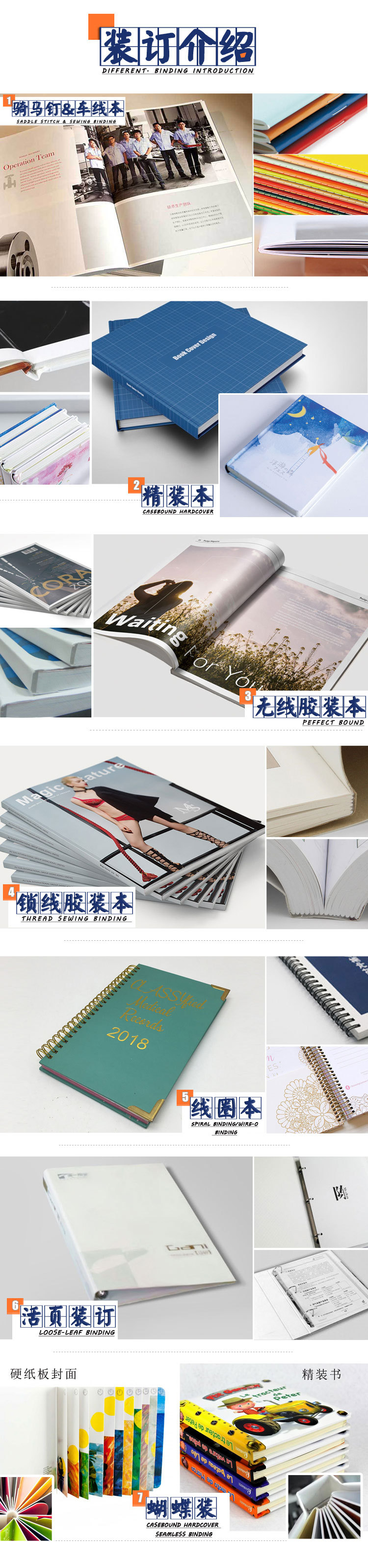 根据您的要求进行单独的设计、制作、印刷。内容、款式风格等都是专一的。整个过程都是专门围绕着你的需求而开展的,工序有:设计风格小样--设计印刷稿--出菲林片并打印刷样--制版--印刷--裁切--裱板--分页--修边--打孔--穿环压环--质检--包装--交付。此外还有:复膜--烫金银--起鼓--过油--模切等印刷工艺工序根据产品的要求按需加入。