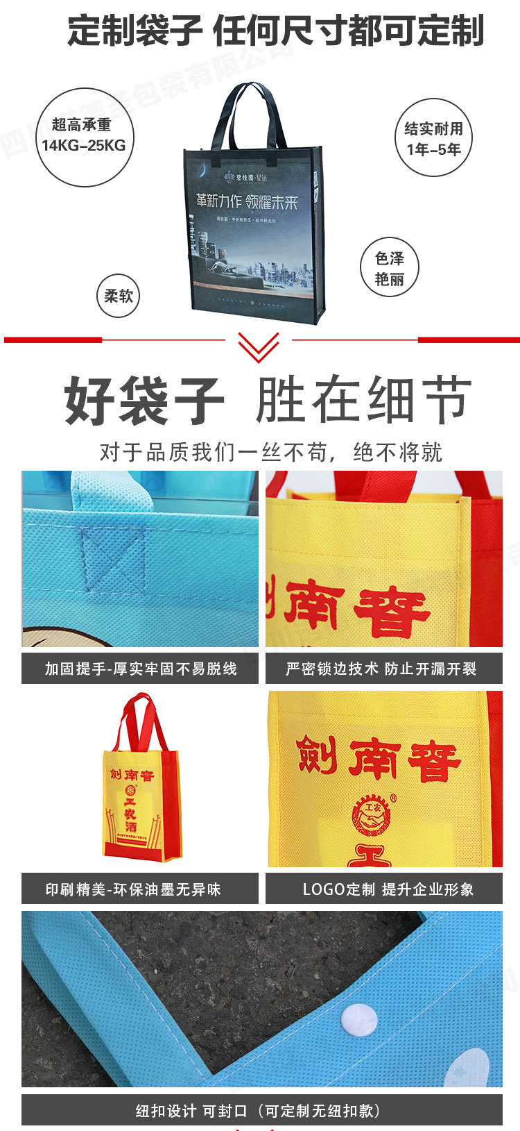 诺德圣无纺布制袋工厂是一家设计、研发、生产与销售为一体的现代化包材企业,本厂专业生产无纺布手提袋,广告袋,宣传袋,帆布袋,环保袋,彩印袋,覆膜袋,一体成型袋,立体袋,布袋,束口袋、自封袋,无纺布地膜,无纺布门套,无纺布窗户套等产品,本厂品质过硬、信誉佳美,在国内和国际市场得到不断的拓展,深得客户的一致好评。 我厂产品销售全国各地,优质的产品、合理的价格、完善的售后服务,我厂产品在市场上享有良好的声誉,得到广大客户的喜爱。我厂拥有完整、科学的质量管理体系。诺德圣无纺布制袋工厂的诚信、实力和产品质量获得业界的认可。欢迎各界朋友莅临参观、指导和业务洽谈。