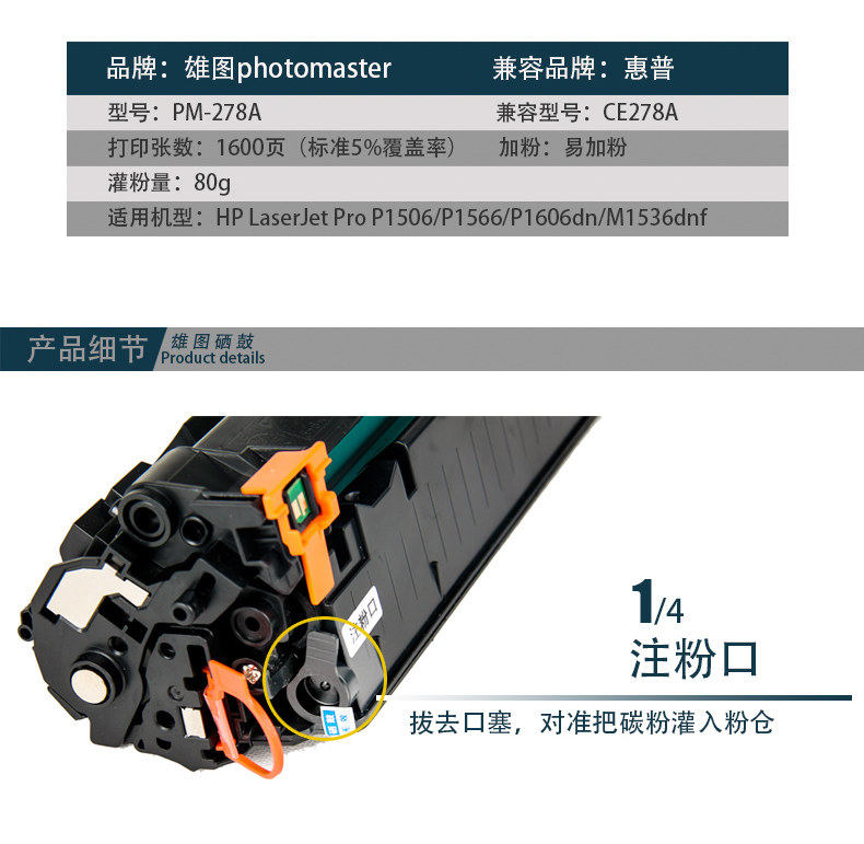 雄图惠普易加粉CE278A硒鼓m1536dnf p1606dn 1560 1566墨盒批发