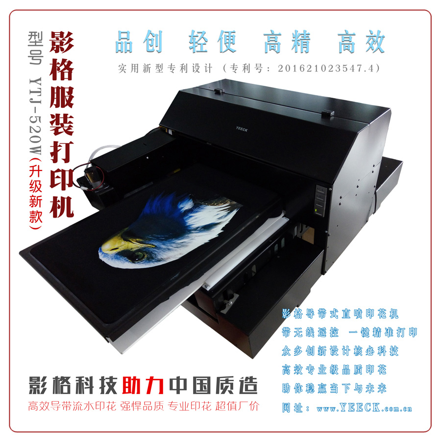 影格升级版新款T恤打印机ytj-520,两年潜心研发,设计无比精简,技术秒杀市场任何一款同幅面机器(包括某些价格在5万10万以上的进口服装直喷印花机哦),可以多工台作业。欢迎购前打样,观看更多视频请加W信帐号:iyeeck