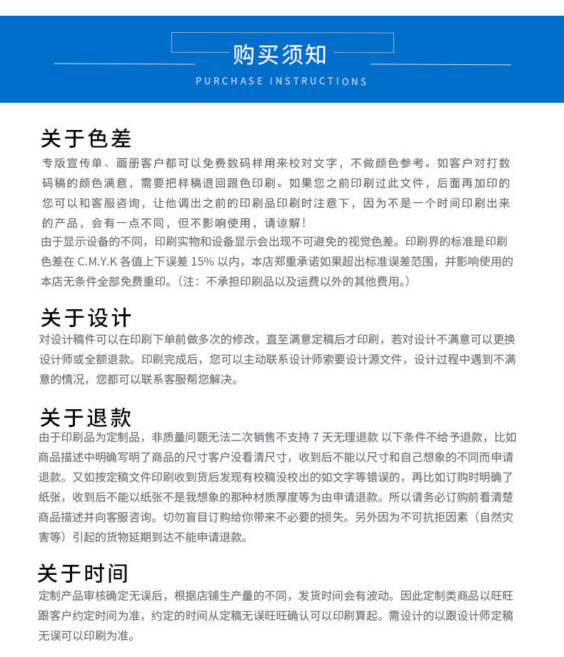 答:我们的商品说明中已经明确写清的问题是不能退款的,比如商品描述中明确写明了商品的尺寸客户没看清尺寸,收到后不能以尺寸和自己想象的不同而申请退款。又如按定稿文件印刷收到货后发现有校稿没校出的如文字等错误的,再比如订购时明确了纸张,收到后不能以纸张与想象中有差距等为由申请退款。我厂印刷用纸全部采用大品牌足克重A级纸张。订购前看清楚商品描述并向客服咨询,切勿盲目订购给你带来不必要的损失,另外因为不可抗拒因素(自然灾害等)引起的货物延期到达不能申请退款。