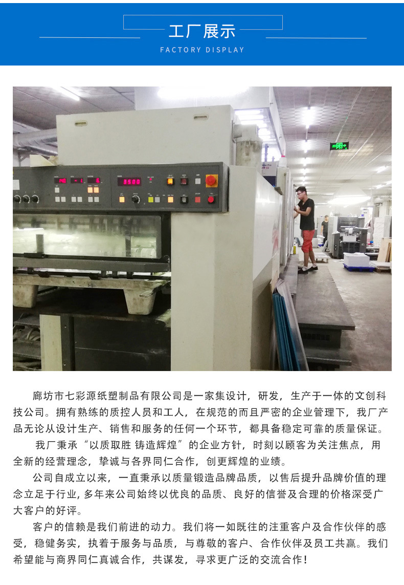 答:正常四色印刷,因为每个人使用的显示器品牌不同均有色差,再加上印刷色彩与屏幕显示属两种不同的色彩概念,采用不同原理,所以印刷品色彩与屏幕显示色彩会有误差,我们将严格按照文件中CMYK色值标准印刷.印刷色差CMYK各值上下10%左右,这是正常的色差,如果您不能接受色差请勿订购。如果对颜色有特殊要求可与客服沟通,也可来厂盯机印刷,印刷师傅可现场根据您的要求在文件色值范围内进行微调。