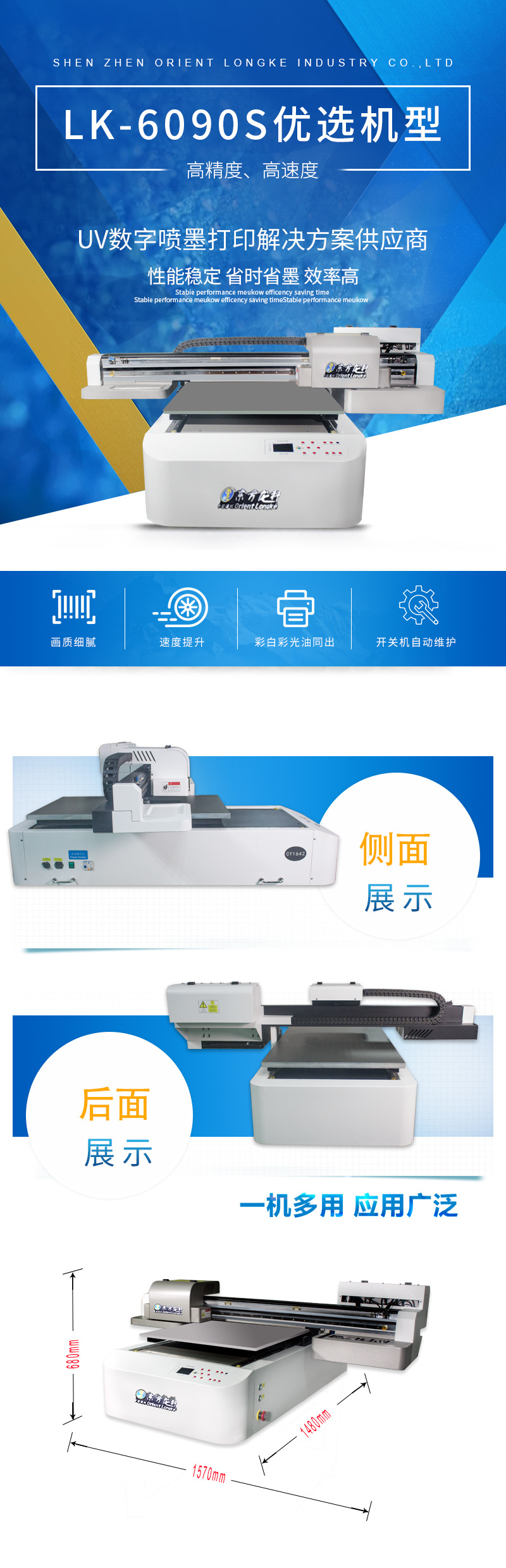 平面印花机 巧克力蛋糕棉花糖饼干彩色数码喷墨印 小型uv打印机,欢迎您选择东方龙科17年品牌的产品,全球时候,品质保障! 这款UV打印机能打印什么产品? 1、可打印任何平面上的图案和曲面上的图案(曲面需要制作夹具); 2、可打印任何材质,如广告纸、布匹、金属、塑胶、硅胶、地毯、石材、木板、陶瓷、皮革、玻璃、竹编等等材质(不同得材质需要用到的UV墨水有所不同); 3、可打印高度10mm以内的任何产品(超过高度,需要定制); 东方龙科最大和最小的UV打印机是如何? 1、最小常规的机器为LK-6090S,具体打印尺寸:长0.6米,宽0.9米; 2、最大常规的机器为LK-5040,具体打印尺寸: 长5米,宽4米; 3、东方龙科有20款不同打印尺寸的机型供您任意选择。 东方龙科UV打印机使用的什么喷头? 1、对于生产类型的客户,我们主要匹配理光工业喷头,如Gen6、Gen5、Gh2220; 2、对于一般客户,我们可以为客户提供爱普生xp600及4720喷头; 3、客户可以选配如精工、柯尼卡等其他知名品牌的喷头。 选择我们的理由是什么? 1、17年全球品牌,产品性能稳定。公司创始于2004年,我们拥有超稳定的打印机板卡,3轴一体控制系统,及优秀的供墨系统; 2、售后有保障。我们的售后团队全部是本公司资历深厚的技术骨干人员组成(非外授权),目前售后团队有60+人,随机分布在全国各地,24小时内可上门; 3、公司规模。我们有300+人以上的员工,UV打印机月产能100+台,公司占地面积14000平方米,属于大型工厂企业; 4、我们的核心。可以快速为客户定制非标UV打印机,定制周期30-40个工作日内交货; 5、用户累计超过125000个。我们的产品在确保国内销售的同时,于2009年进军全球,产品销往60个国家以上,我们的售后全球无死角。
