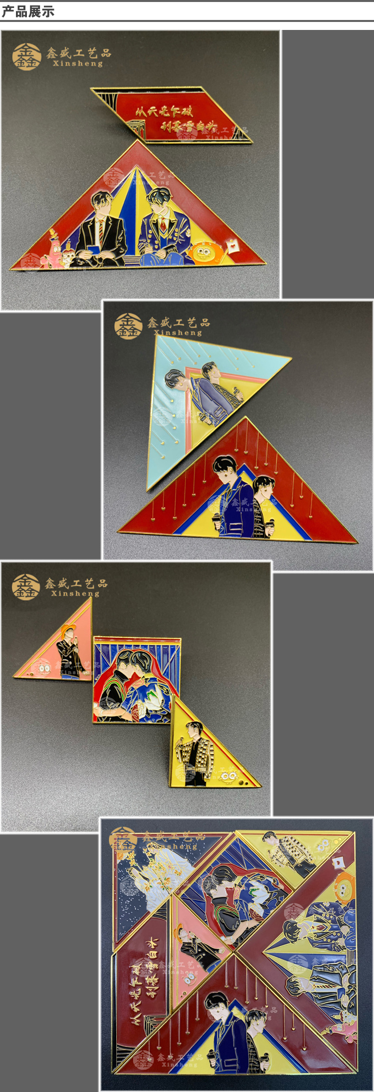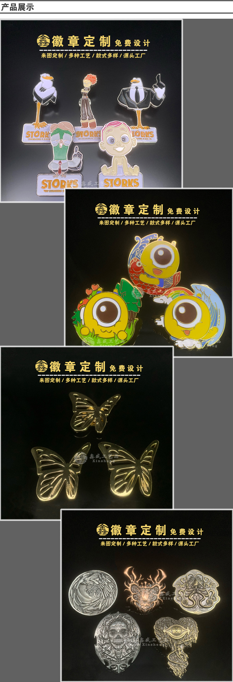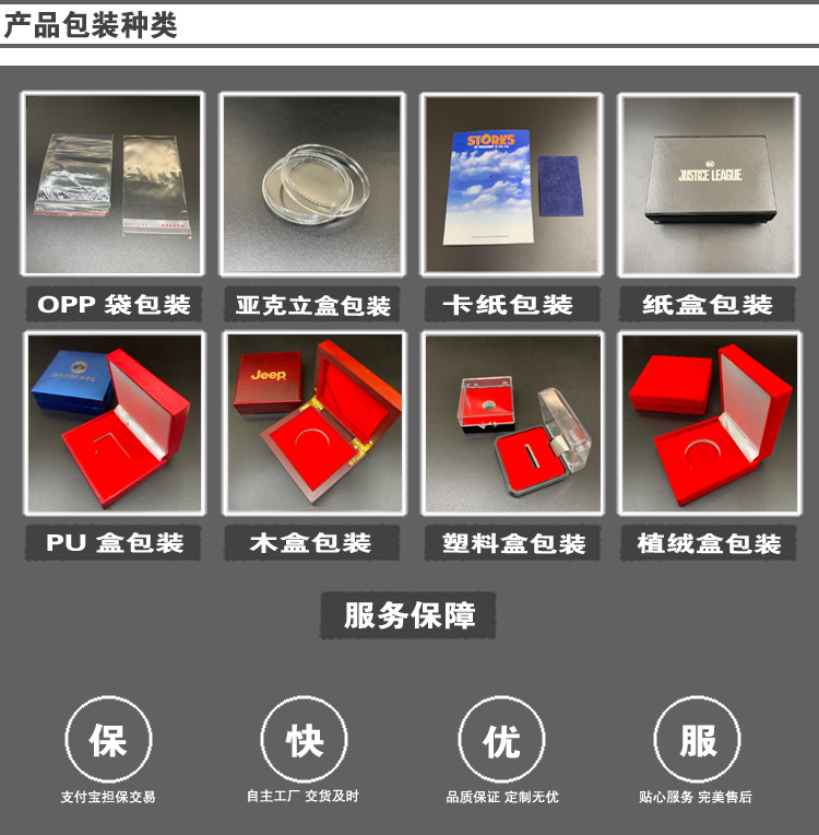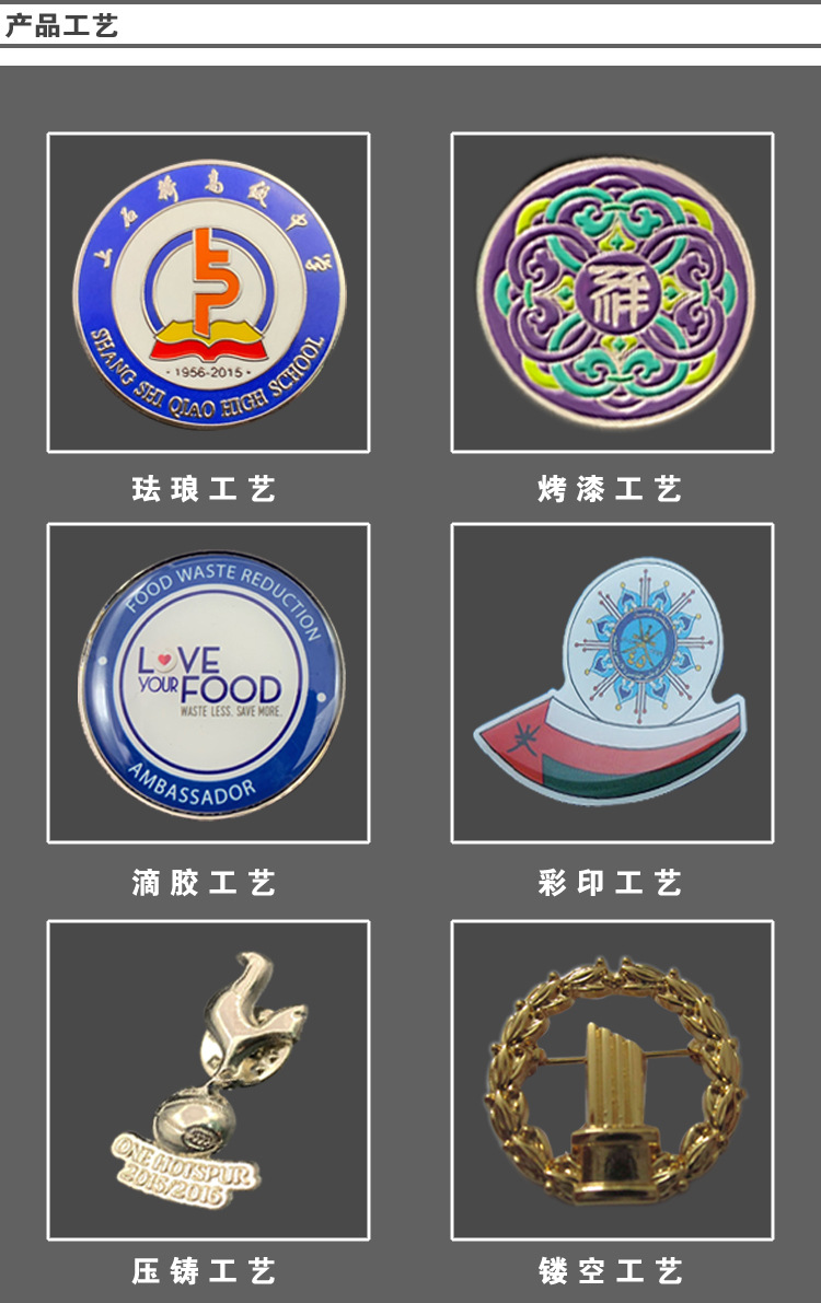 专业从事各种徽章胸章;纪念章纪念币;奖章奖牌勋章;袖扣领带夹;钥匙扣;办公摆设品;书签拆信刀;纪念盘奖盘;筹码游戏币代币;金属挂件;开瓶器;镂空片;标牌等等各类压铸工艺品;冲压(液压)工艺品;腐蚀工艺品制造;五金配件等。