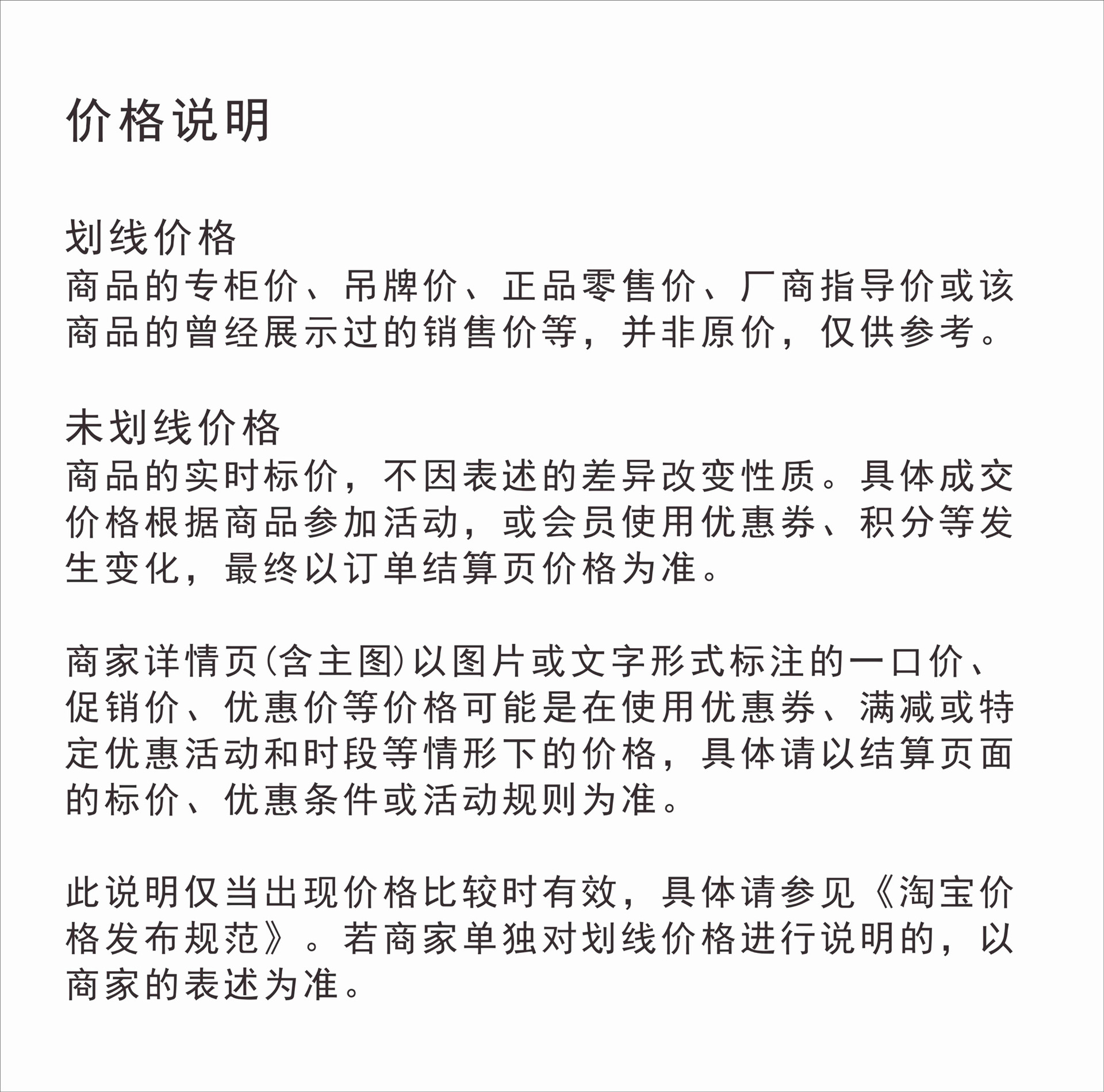前述价格未计算平台发放的各种采购津贴、跨店券、红包等优惠,未计算商家设置的满减优惠、优惠券、店铺返利金、店铺会员折扣以及L会员价、商家设置的指定人群单品优惠活动等各种优惠; 该价格会计算其他非平台活动下的各种优惠(包括商家自行设置的非指定人群的单品优惠等,最终以商家的自行设置为准)。前述商品销售价格指商品页面当日展示的标价;若当日商家多次调整销售价格的,取当日最后展示的销售价格。