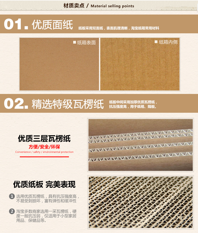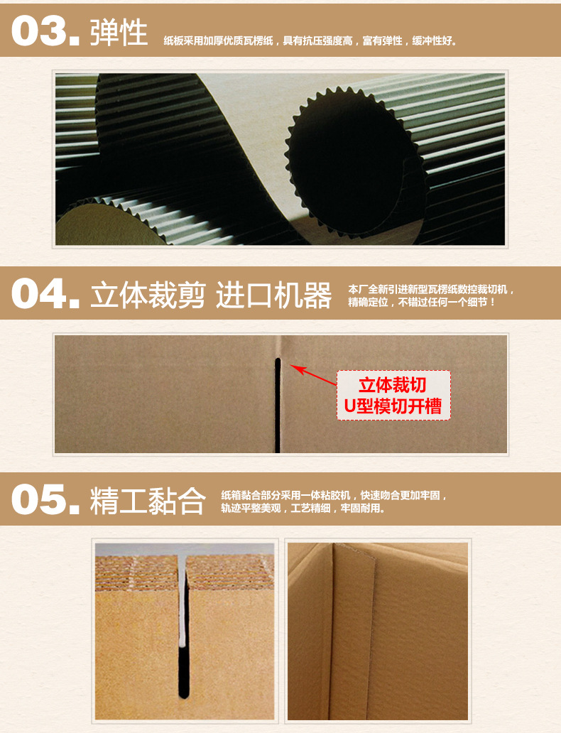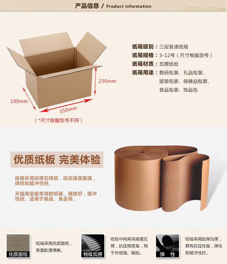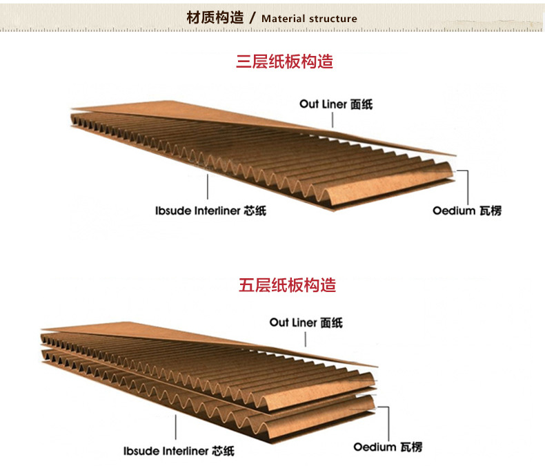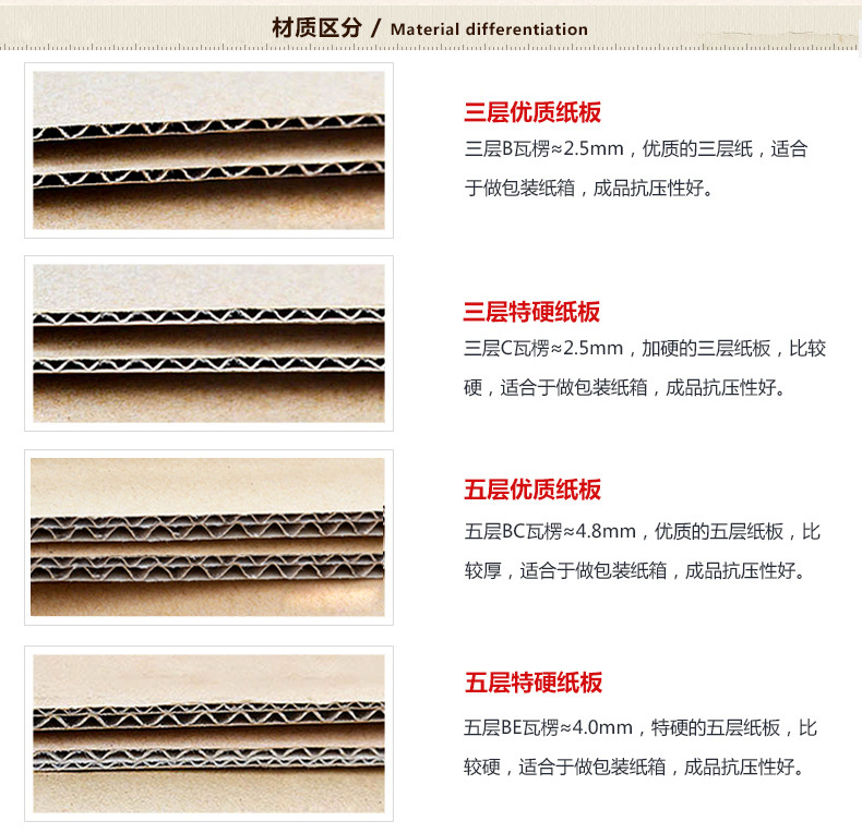 五层A级140克加强:1-4#采用AB加强瓦楞,厚5-7mm(原料厚7mm,加工后测量略有误差),硬度很好!5-10#采用BE加强瓦楞,厚4-5mm(原料厚5mm, 加工后测量略有误差)硬度超硬! (适合重物,双瓦楞保护宝贝,更安全)