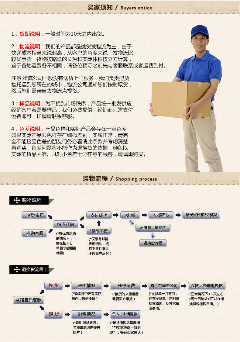 4 本店只陕晋冀鲁,东西不值钱,不够运费,建议到本地购买。收货地址请在交易中留正确,不要在旺旺中修改,由于接单较多,不一一进行确认接单与打单人员不是同一人,也容易搞错。若留错地址,事后在旺旺中说明而引起的发错地址,后果自付哦,谢谢配合!