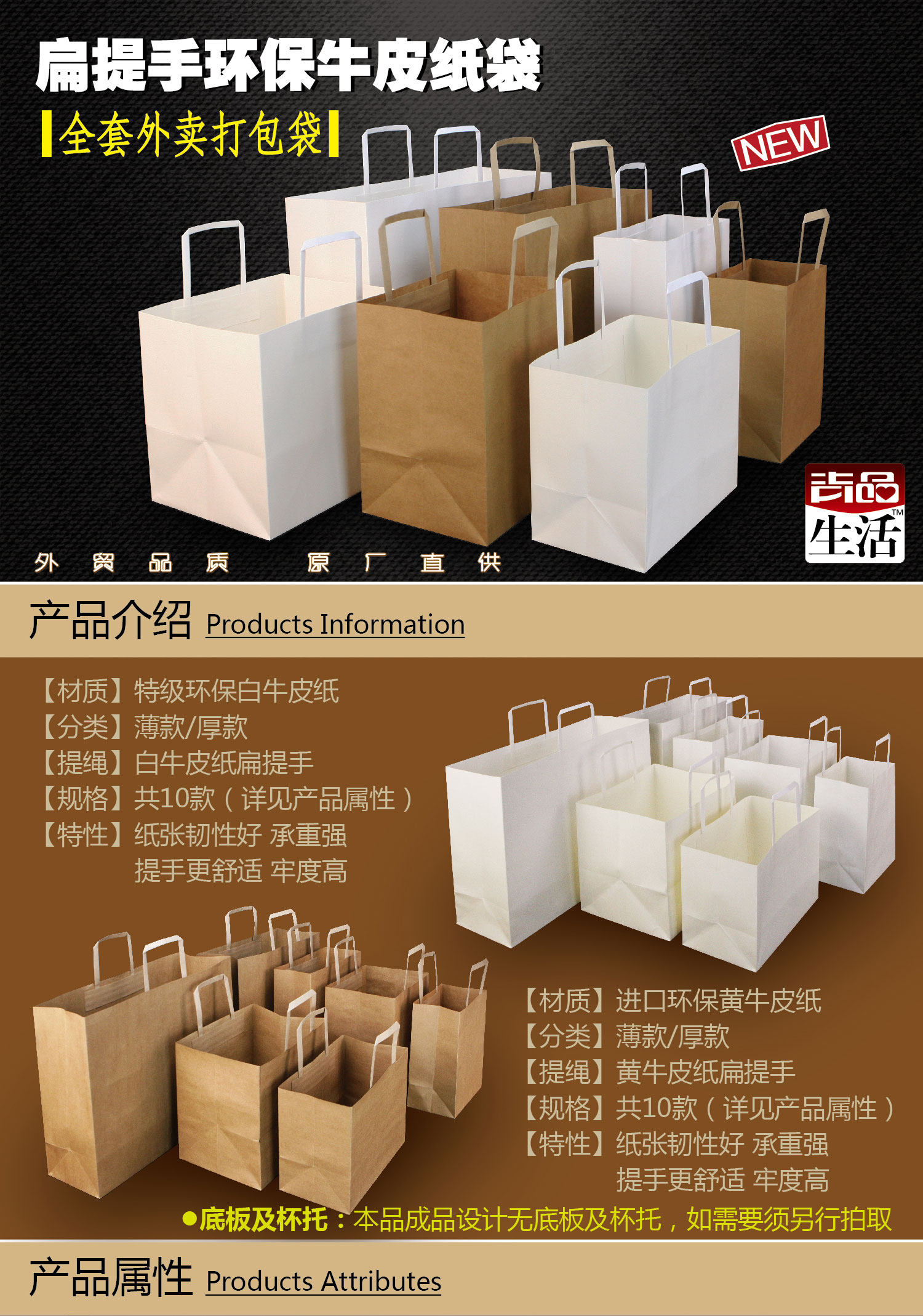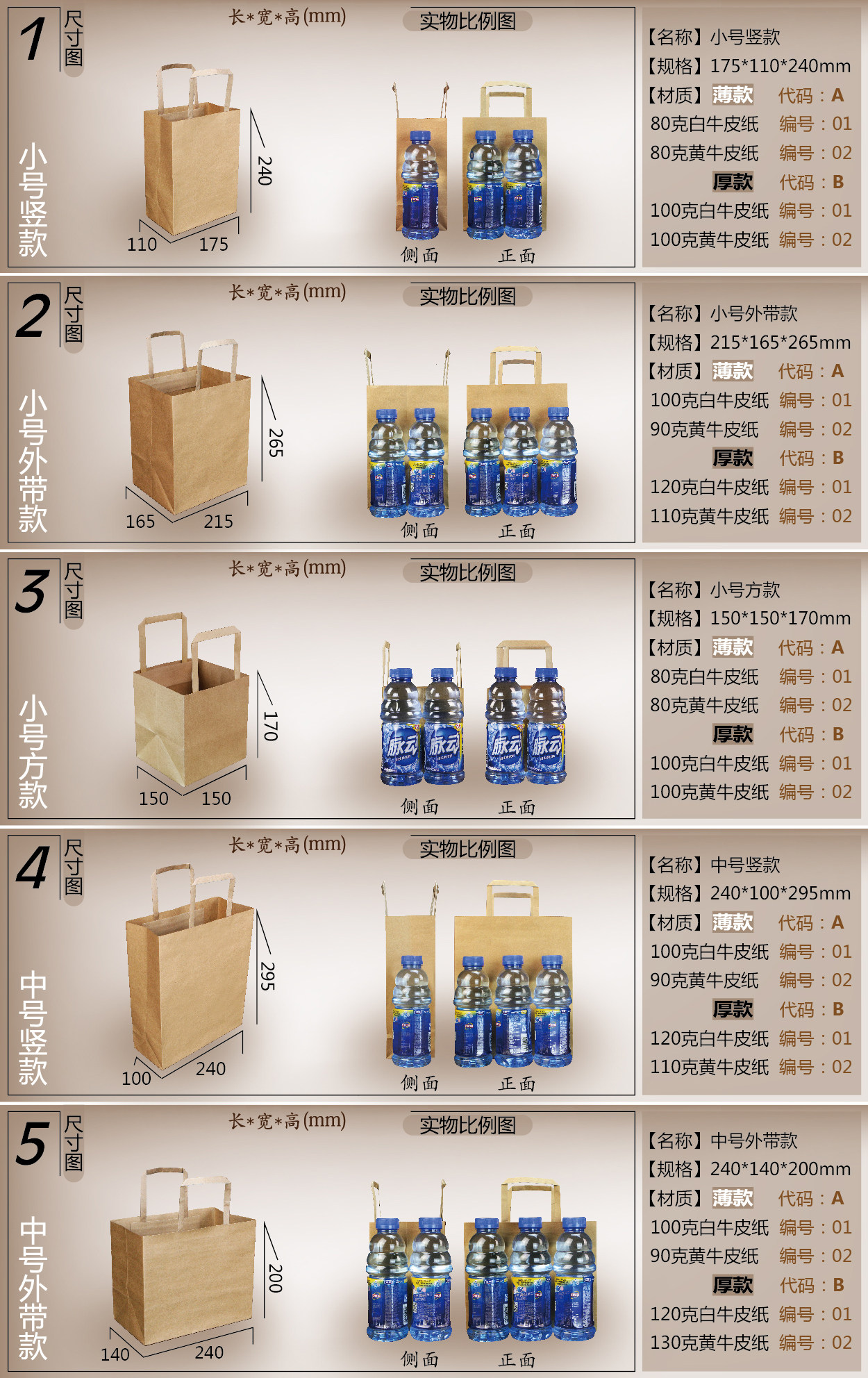 名称:通用手提袋-白牛皮扁绳系列 规格(mm): 小号竖款175*110*240小号外带款215*165*260中号竖款240*100*295