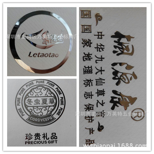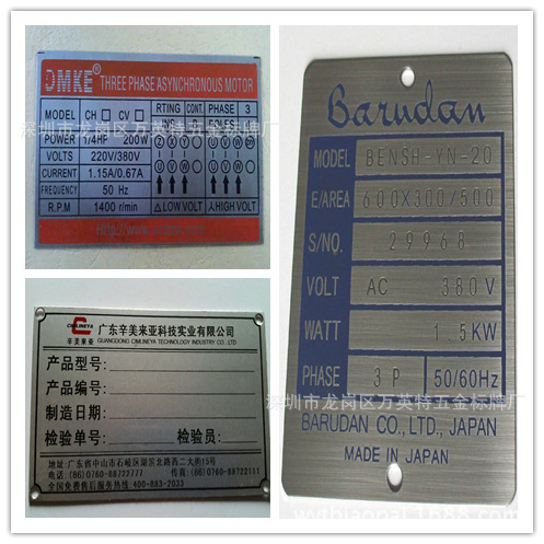 万英特五金标牌厂是一家专业研制、开发、生产、销售各类标牌的一体化厂家,拥有近十年的金属铝标牌、金属电铸镍铭牌、UP商标、水晶滴胶标牌、不锈钢腐蚀标牌、锌合金标牌、PVC、PET、PC丝印等标牌的生产制作经验,主要适用于电器、家具、门业、卫浴类、柜类、家电、电子数码音响类、机械等产品。