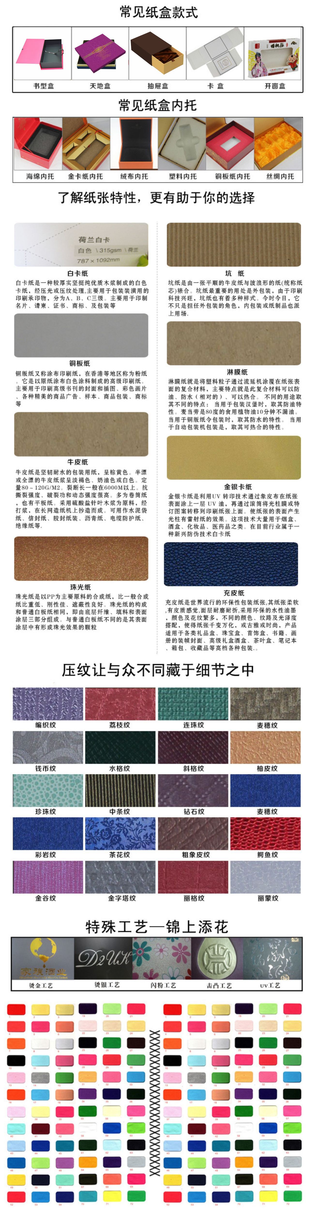 专业生产及设计各种茶叶盒,精品包装盒,礼品盒,养生酒类包装盒,葡萄酒类包装盒,锦盒,产品包装盒、电子产品包装盒、首饰包装盒、化妆品包装盒、药品包装盒.保健品盒,月饼盒,烟盒,彩盒,食品盒,手机盒,高档礼品盒,产品盒,光盘套,药盒,酒盒,月饼盒,化妆品盒,保健品盒,高档笔盒鞋盒,领带包装盒,食品盒,贺卡.数码包装盒珠宝盒,名牌手表盒,首饰盒,化妆品盒,鞋盒,酒盒,领带盒,,时尚PSP盒 首饰盒,食品包装盒巧克力盒,,台历、挂历、高档画册、手提袋、收藏品包装盒(箱)等5000多个品种。创意独特,款式新颖,包装精美时尚,工艺精雕细。公司成立十多年来,与很多公司都有过很好的合作欢迎各界有需要的有志之士前来洽谈业务,真诚欢迎您的光临!