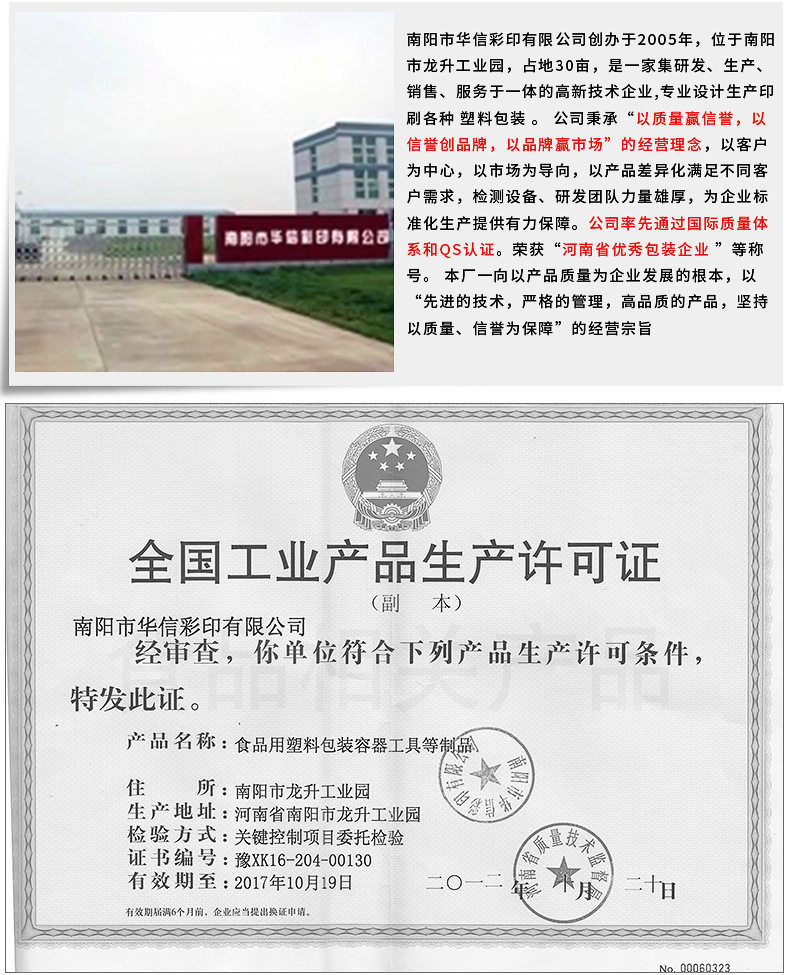 南阳华信彩印业务范围:各种款式塑料包装袋(自立拉链袋/吸嘴袋/开窗牛皮纸袋/真空蒸煮袋/液体农药袋/卷膜),无纺布手提袋,低压平口袋,纸箱盒子,大米编织袋等