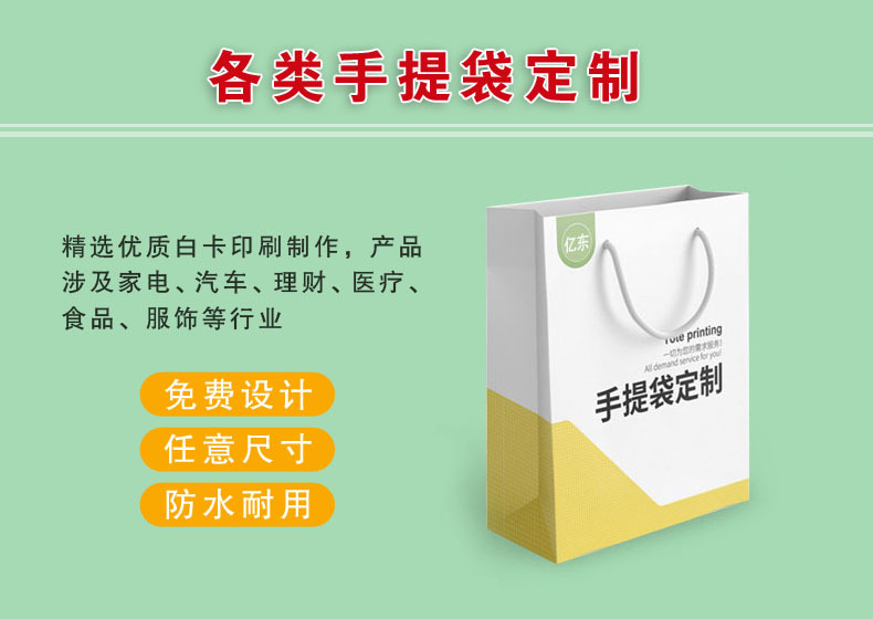 寸、数量、后道工艺需求不同,没办法标出准确价格,以客服报价为准。 本品为定制产品,非质量问题不支持7天无理由退换货。 因手机、电脑显示的颜色为RGB模式,而印刷是CMYK模式,所以会存在一定的色差,这是全世界都无法避免的问题,纸袋采用250克手提袋专用白卡纸印刷;本品概不接受:“颜色不一样”,“纸的厚度不一样”,“和我想的不一样”等理由退换货或补货。