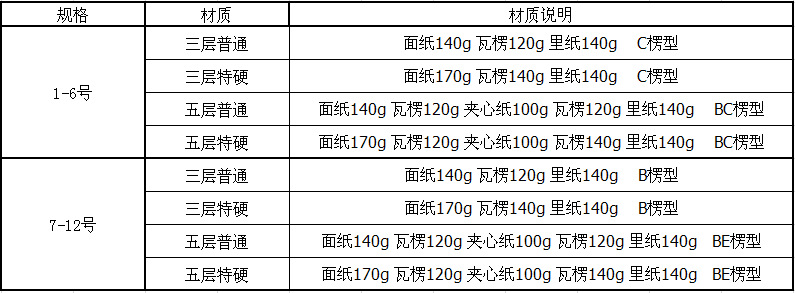 美成纸品主要生产销售包装过程中所需的;纸箱、纸板、纸护角、彩印纸箱、彩印纸盒、刀卡、平卡、见坑卷纸等瓦楞纸箱和纸制品。公司采用玖龙纸业、理文纸品、奥洲牛卡、台湾黄纸、俄罗斯牛卡等众多国内外品牌的原纸材料,可做三至七层多种纸质供给客户选择。原纸代码为;H=230克高纤维牛卡(高性能材质),G=200克高纤维牛卡纸(高性能材质),K=200克牛卡纸,F=160克牛卡纸,A=140克普通箱板纸,B=110克普通箱板纸。芯纸采用金洲高强芯180克、140克、120克,和普通芯纸,坑纹形式有A坑、C坑、B坑、E坑、F坑,并可跟据客户要求要调整坑型配比。