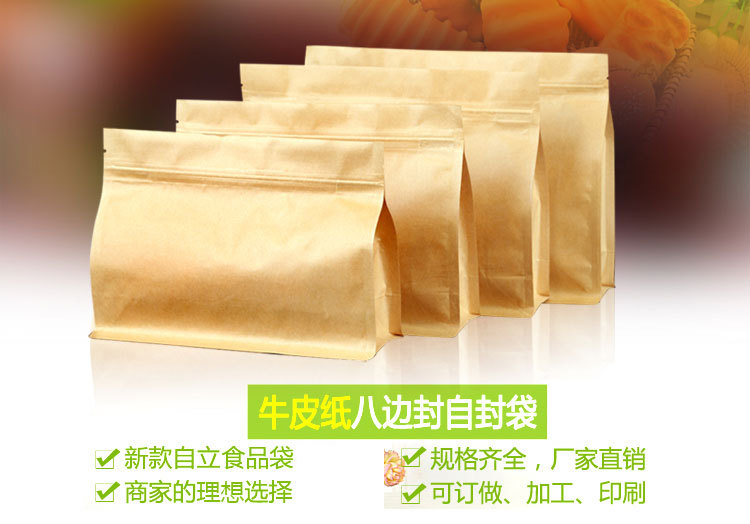 现货 26*19+8八边封牛皮纸横版自立包装袋 自封牛皮纸食品袋50只