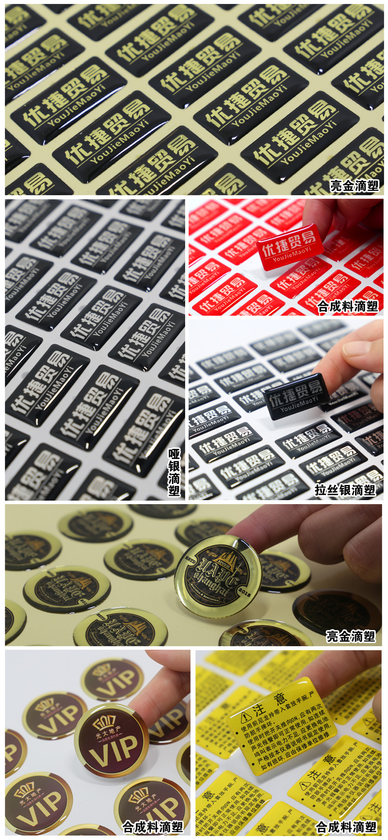 采用环氧树脂生产各种平面透明软硬水晶胶制品,各种印刷商标表面的披覆及灌注,制作成精美的滴塑标签,使您的产品更加美观大方,为您的产品锦上添花。