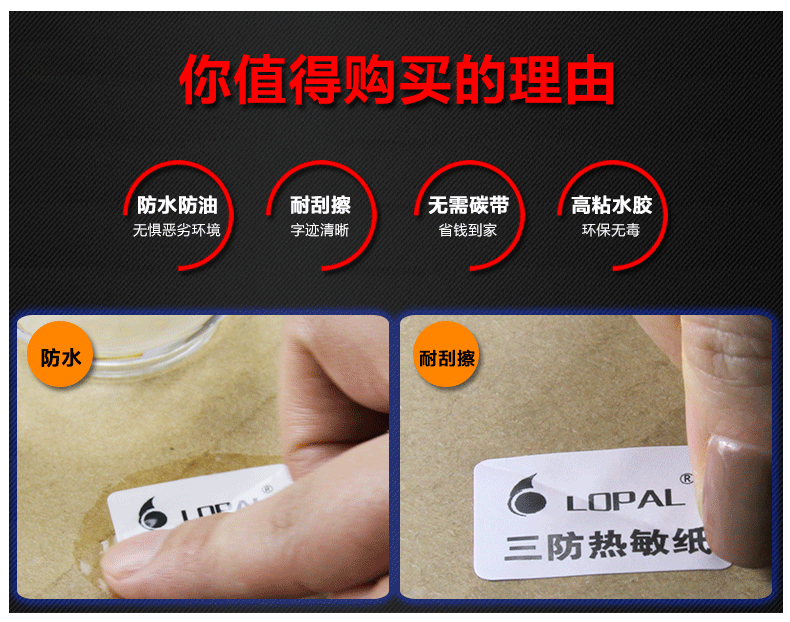 无需碳带打印,经济实惠更效率,环保水胶,越粘越牢,打印清晰,不伤打印头。!