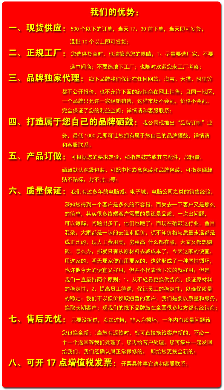 本店所以图片百分百实物拍摄,我们是一家专门从事生产硒鼓的老工厂,直接把利润让给客户,本公司的耗材产品质量优越,价格实在,交货及时,深受客户们的广泛青睐,全面、快速的客户服务中心;本公司本着凭质量求生存,不断持续改进,为我们客户提供高品质、低价格的产品。我们的品质方针是:质量第一,精益求精,持续改进,顾客满意为宗旨!