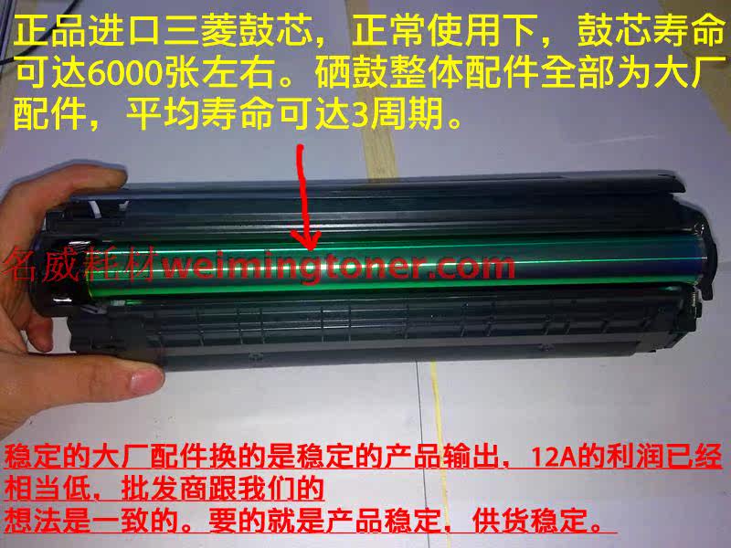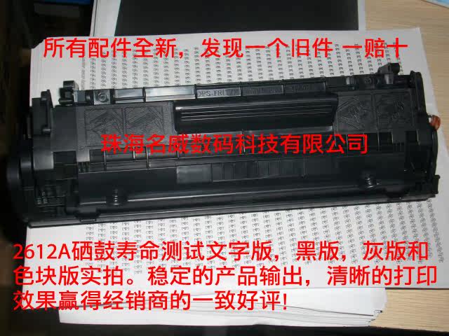 •全新硒鼓(汇威/迪迈胶件、三菱鼓芯、名威充电辊、奔马磁辊、金力/亚可大小刀均为全新,若您是经销商或批发商您肯定是懂配置的。我们这个配置远远高于一般中小工厂的用料配方,此配方量产的2612A硒鼓使用寿命可达到3-5个周期(注在加粉工艺操作正常的情况下):)