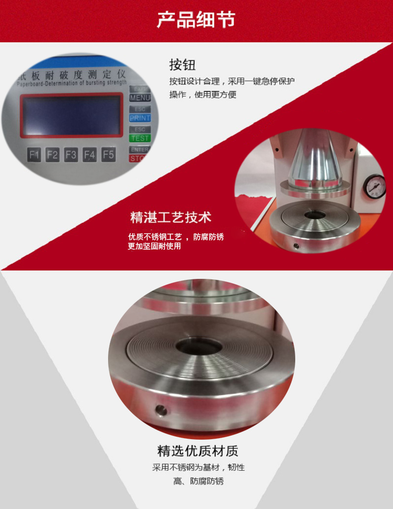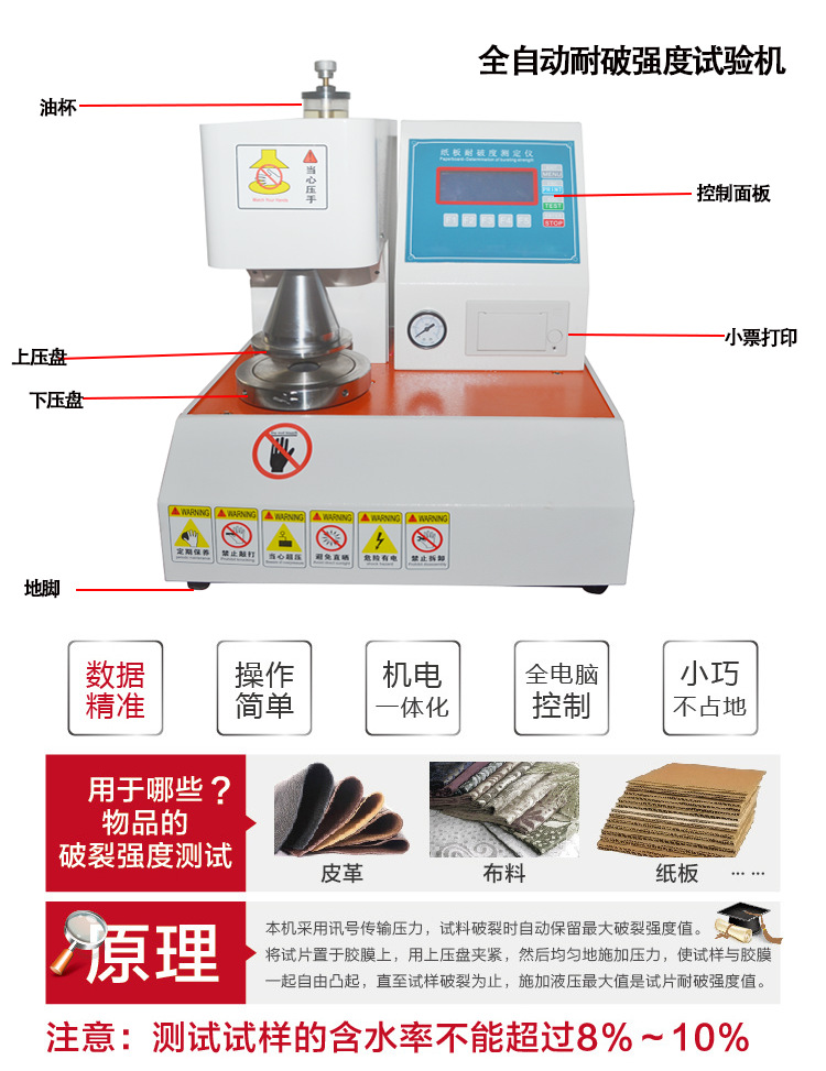 采用液压递增法原理,使用先进的微电脑检测控制系统和数字信号处理技术测定纸板耐破度,合 ISO 2759《纸板耐破度的测定》、和GB/T1539《纸板的测定法》标准,适用各类纸板及皮革、布皮革等耐破强度试验。全自动破裂强度试验机是测试纸箱纸板的破裂强度值,采用数字显示压力,在试料破裂时,自动保留大破裂强度值,同时可趋势打印检测结果。破裂强度试验机的指示方式为数位式,容量为0-100kg/cm2。破裂强度试验机广泛的适用于