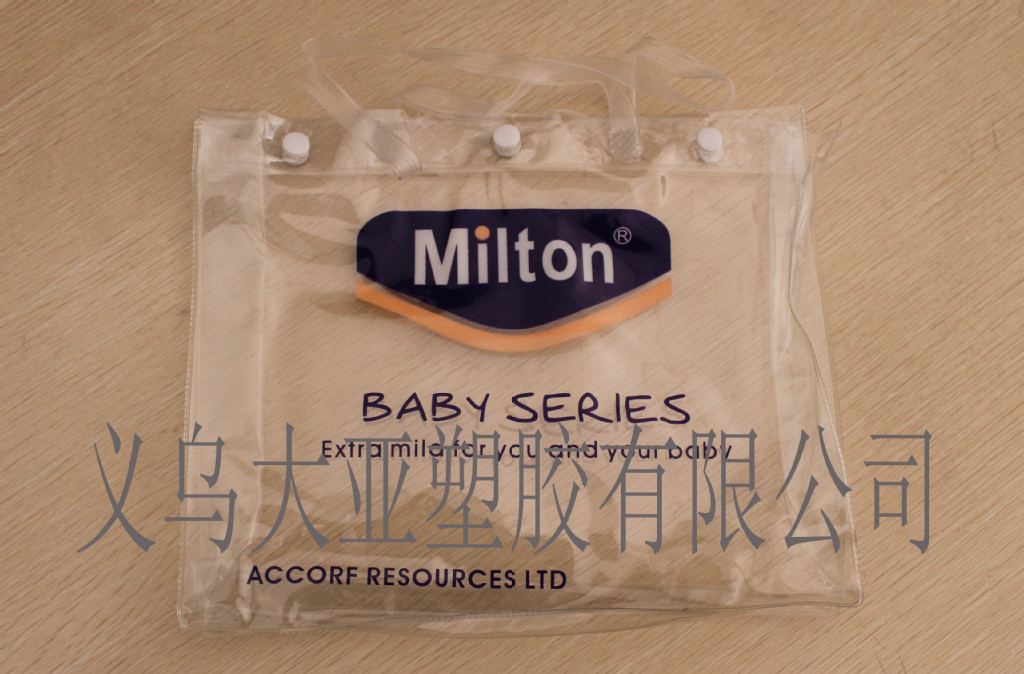 义乌大亚塑胶有限分司专注生产各种热压PVC袋,此款PVC手提袋材质为超透明0.25MM厚的PVC材料,手提为PVC扁带,有三个按扣封口,是一个模具热压而成,做工精致,一个好的包装能让您的产品锦上添花,超越的不仅仅是价值.我们可以订做不同款式,不同尺寸的PVC袋,一般起订量5000只.欢迎来样来稿订做,请需要询价的朋友们,发详细信息(尺寸,材料厚度,有无印刷,数量等)给我们,联系方式:15257977954谢先生 0579-85211949 邮箱:307782629@qq.com www.dayasj.com
