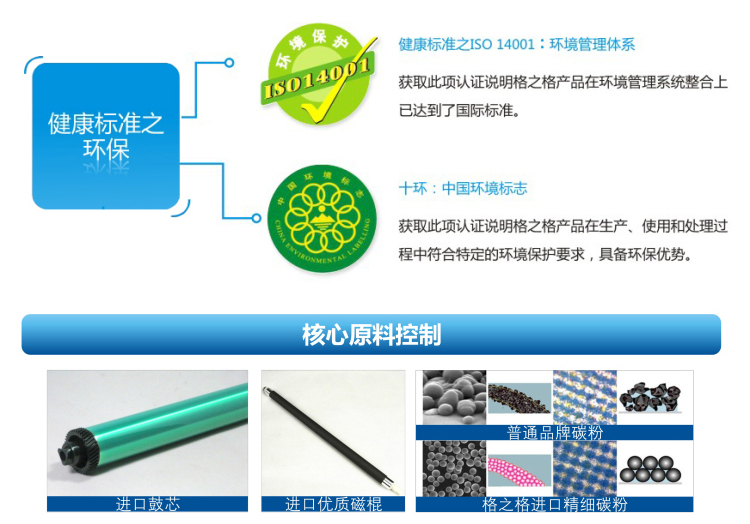 | 格之格推出的健康标准格之格硒鼓产品,在保证打印品质的基础上,更注重对环境的保护,生产过程严格执行ISO14000环境管理体系标准,产品通过了**环境保护部环境认证中心的“十环标志”认证,而文稿底灰值远远低于行业标准,采用了业内**的先进技术,大大提升了碳粉的利用率,有效减少了废粉和底灰,更低碳,更环保。碳粉利用率高,转印率高达90%以上,废粉率低于10%,底灰值≤0.008,业内**,更低碳,更环保。 |