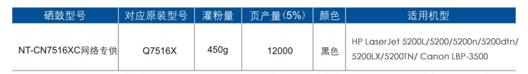 | 格之格NT-CN7516XC加大容量硒鼓特点: 1、产品出厂灌粉量为450g,比标准容量硒鼓有更高的灌粉量,打印页数可达12000页以上(5%覆盖率)。 2、硒鼓打印清晰度高,黑度可达1.4以上,底灰小,保证良好的打印效果,达到原装同等水平。 3、加大容量硒鼓使用更先进的打印技术,填充更多的碳粉,可比标准硒鼓多打印2000张。 4、采用**感光鼓芯及配件,确保硒鼓碳粉,极大减低打印成本! 适用机型: HP LaserJet 5200L/5200/5200n/5200dtn/5200LX/5200TN/ Canon LBP-3500 |