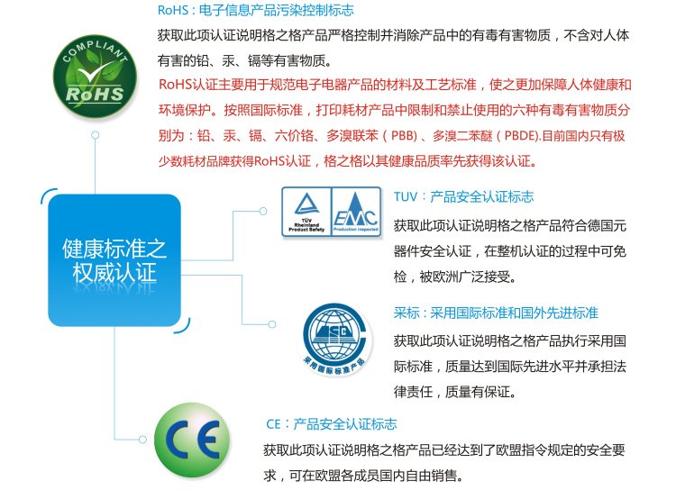 | 1、产品通过CE、EMC、TUV、ROHS等**安全认证,不含有对人体有害的铅、汞、镉、六价铬、多溴联苯(PBB)、多溴二苯醚(PBDE)等有害物质;CE、EMC认证是欧盟的安全标准认证, TUV认证是德国的标准,我们的产品长期出口欧洲、美国、日本这些发达地区,他们对健康、安全的认证标准是极为苛刻的 2、产品必须入围央采定点采购品牌,获得政府、医疗、金融等广大行业用户的认可 |