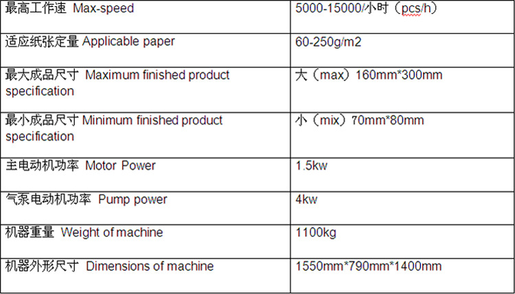 该机采用底部给纸技术,分纸稳定、可靠,无需停机续纸,自动压痕,自动上胶,自动吸气滚筒进行两次横折及简单实用的纵折机构,可**完成封底和封舌折叠,收封部件配有电子预设计数、分组装置。
