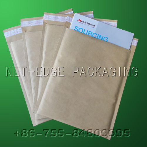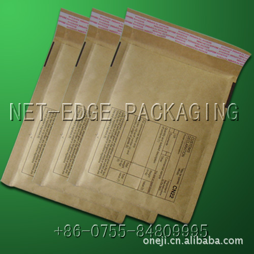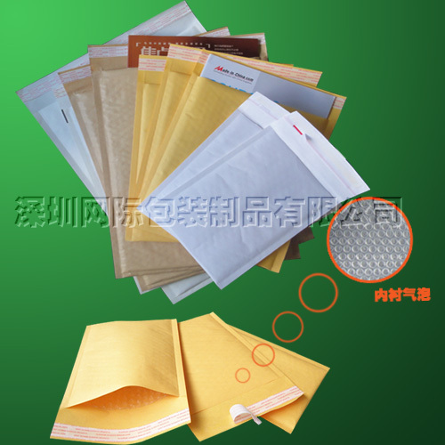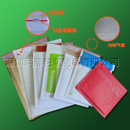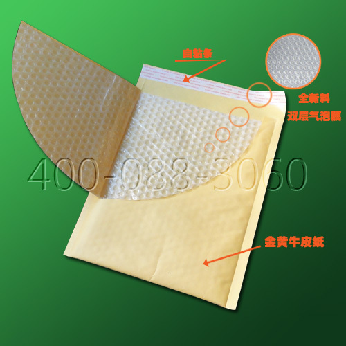 又名:牛皮纸气泡袋 材质:牛皮纸/PE 结构:外层为牛皮纸(白色、黄色或本色),内衬气泡膜 作用:外层为牛皮纸(白色、黄色或本色)表面平整,易书写;可在不侵犯他人知识产权的情况下,根据客户要求印刷不同图案、商标及文字;内衬气泡膜,具缓冲防震作,防止物品因压, 碰, 跌落而损坏;各层材料间不使用任何胶粘剂,完全无毒环保;信封口自粘条设计,安全便捷; 推荐使用范围:邮寄光盘碟片、磁带、电子元件、集成电路板、光学镜头**、证件、相框、礼品、钟表…等物品。