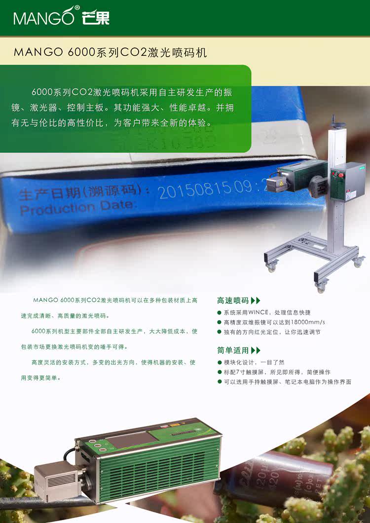 芒果6000系列CO2激光喷码机采用自主研发生产的振镜,激光器,控制主板。其功能强大性能卓越,并拥有**的高性价比,为客户带来全新的体验。