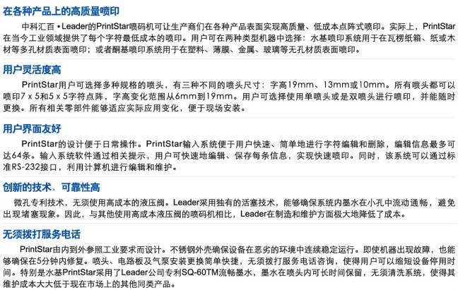 使用方便、操作简单、质量可靠,可在不同材质的各种形状物体的凹凸面上印刷,印刷的字迹、图案清晰、美观。适用范围广,功能强,可用于鸡蛋上打码、印字、打印商标及出场日期。