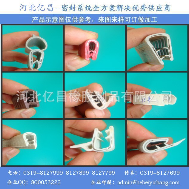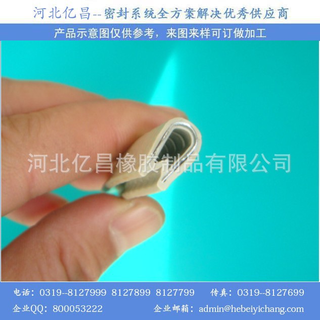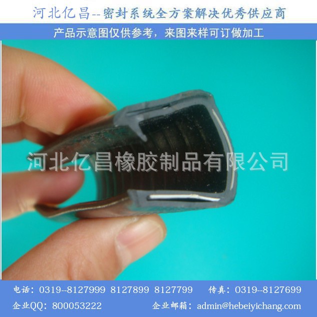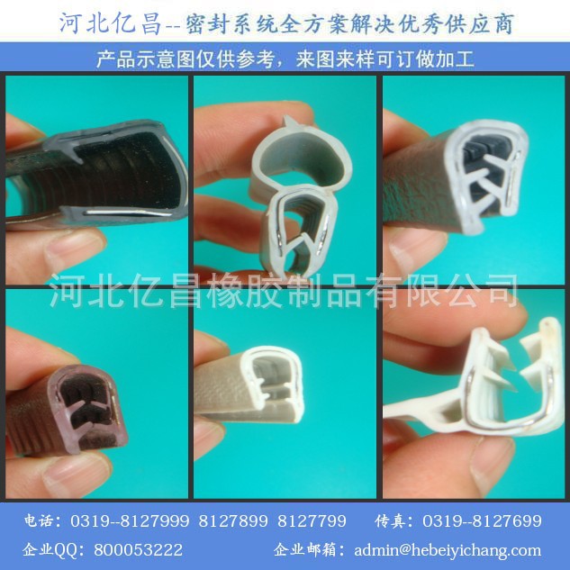可分为实芯制品(圆形、方形、扁平形断面形状)、中空制品及金属橡胶复合制品等类型。其中,金属橡胶复合密封条占60%以上。对于橡胶密封条来说断面设计至关重要。首先是密封唇边形状、尺寸设计,两侧密封唇边应以相同的、大小适当的力从车窗玻璃的两侧接触玻璃。唇边长度、薄厚应适当,过厚、过长会使玻璃升降阻力偏大,过薄、过短又会导致玻璃得不到良好的引导和密封,产生振动、噪音、漏雨现象;其次是断面底部形状、尺寸设计,车窗钢槽断面上有凸起,其作用是为了装配导槽,因此,导槽断面底部应设计出相应结构,既易于装入,又能利用密封条自身的弹性附着在钢导槽内,防止其脱出**是外搭边的形状、尺寸,为了改善外观,导槽外饰面应与车身紧密贴合。
