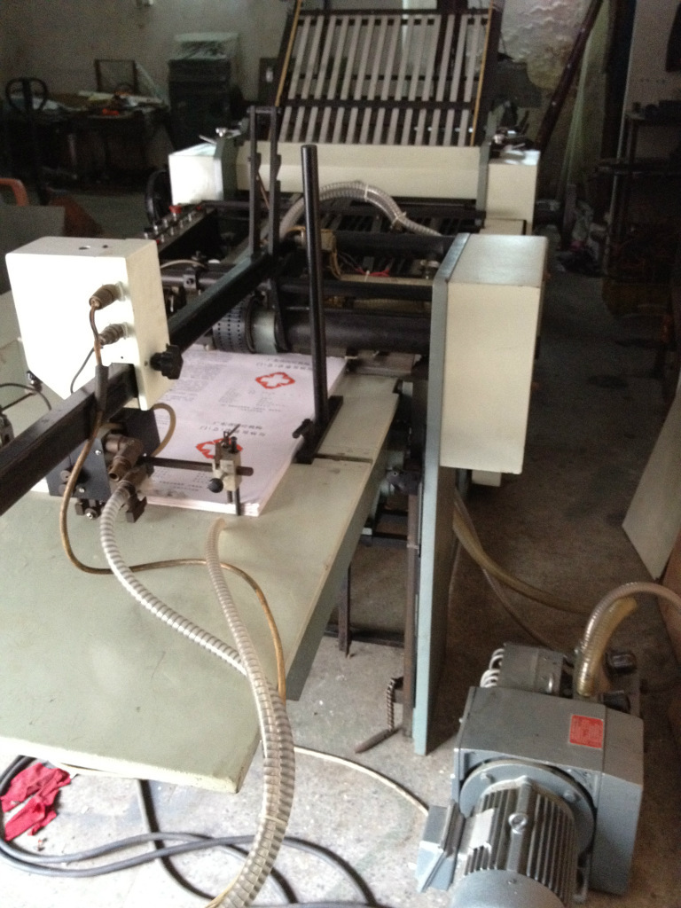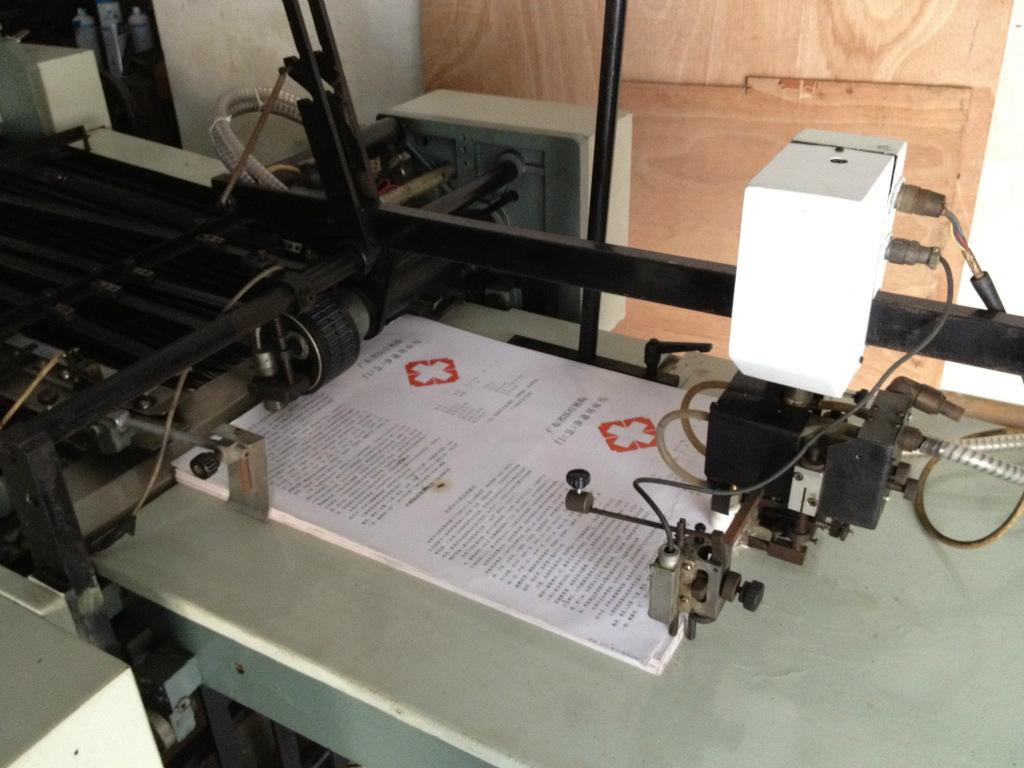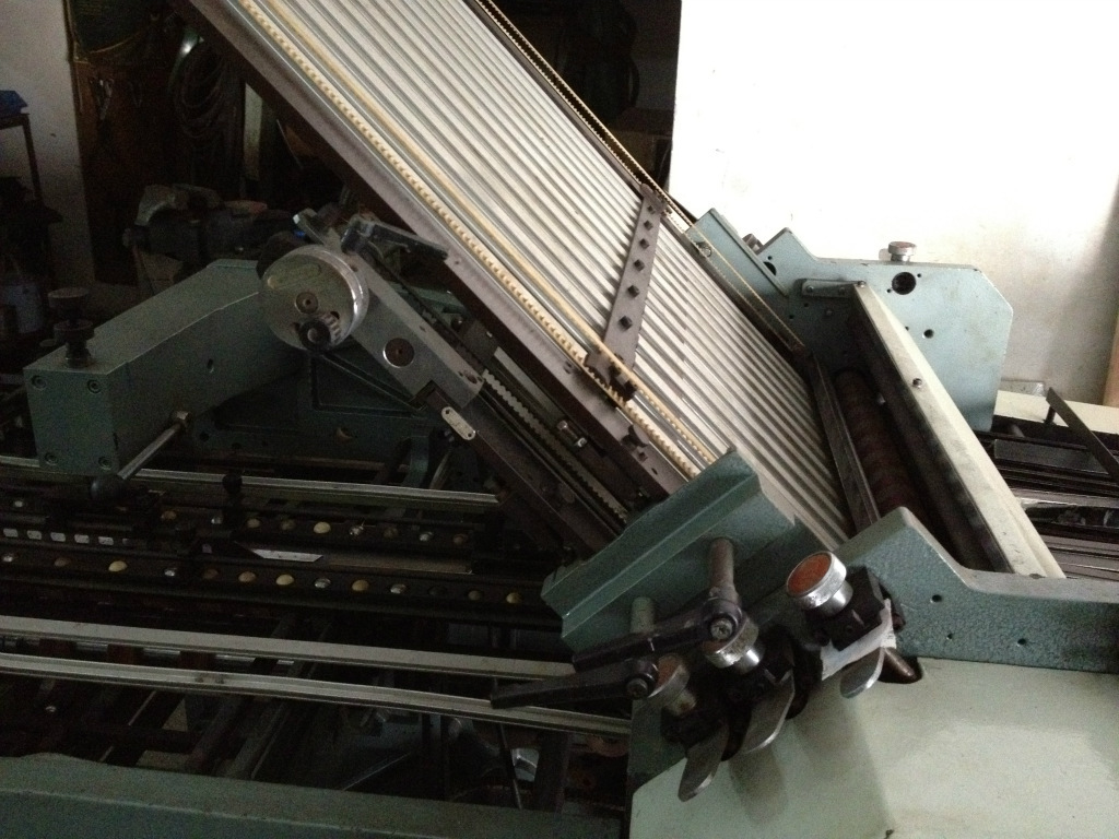本机是单张纸推式给纸,对开刀栅混合式折页机。该机采用栅栏折页时可进行二次平行折页。采用栅刀混合折页机,可进行四次垂直折页,其中第四次垂直折页方向可通过 转向装置按产品要求进行调整,顺折或反折。该机还可按需要配置32开双联正折或反折功能,并在折页过程中按需要进行打孔,压痕和分切等工序。