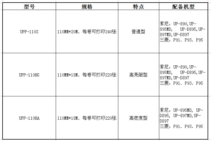 型号:110S A6尺寸黑白超声热敏打印纸 UPP-110S, 是一款普通型的打印纸 , 适用于UP-897MD、UP-D897MD、UP-D895MD、UP-895MD,UP-890MD等, 包装规格:110mm*20m,10卷/盒,10盒/箱,可打印240张/卷 |