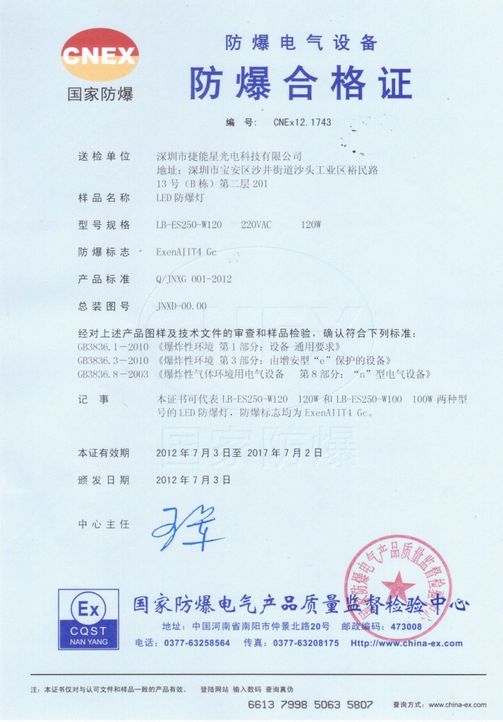大功率LED防爆灯得到国家防爆电气设备合格证,编号:CNEx12.1743X是采用先进的LED照明技术,符合以下标准:GB3836.1-2010《防爆性环境 第1部分:设备 通用要求》GB3836.3-2010《防爆性环境 第3部分:由曾安型“e”保护的设备》GB3836.8-2003《防爆性气体环境用电气设备 第8部分:“n”型电气设备》