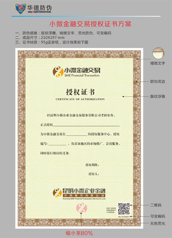 2)防伪技术多种多样,可综合多种防技术于证书上,如团花,潜影,电码,凹凸印,安全线,防复印等等;